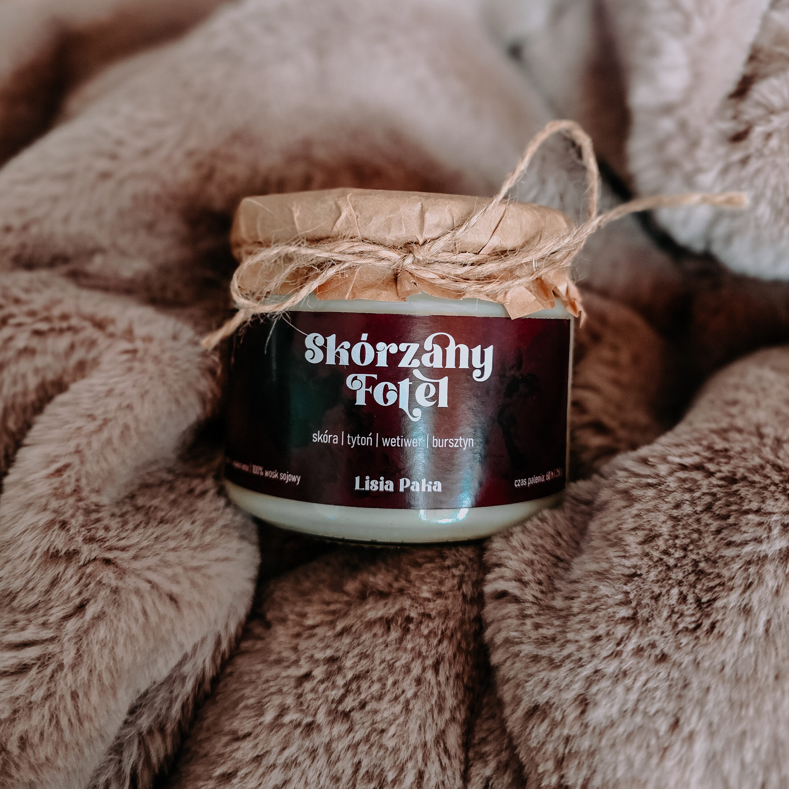 Skórzany Fotel – ręcznie robiona świeca sojowa z drewnianym knotem